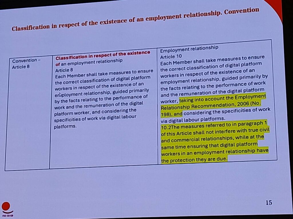 ประเด็นสำคัญคือ การไม่มีหลักเกณฑ์ที่ชัดเจนในการจัดประเภทสถานะการจ้างงานให้เป็น “ลูกจ้าง” ทำให้ภาระการพิสูจน์ยังคงตกอยู่กับแรงงาน และเปิดช่องให้การกำหนดเกณฑ์ในระดับประเทศถูกใช้เพื่อคงสถานะแรงงานแบบไม่เป็นทางการ ส่งผลให้เกิดความไม่ชัดเจนในการตีความ และอาจทำให้แรงงานแพลตฟอร์มไม่สามารถเข้าถึงสิทธิแรงงานได้อย่างแท้จริง ดังนั้น ข้อเรียกร้องของขบวนการแรงงานในเอเชียต่อรัฐบาลคือ เรียกร้องให้ยกระดับเนื้อหานี้ขึ้นมาอยู่ในช่วงต้นของอนุสัญญาเพื่อเพิ่มความสำคัญในการบังคับใช้ และรัฐบาลไม่ควรเร่งออกกฎหมายใหม่ที่เสี่ยงต่อการจัดประเภทแรงงานผิด (misclassification) แต่ควรรอให้อนุสัญญาผ่านการรับรองในเดือนมิถุนายนก่อน แล้วจึงจัดทำกฎหมายภายในประเทศให้สอดคล้องกับมาตรฐานดังกล่าว