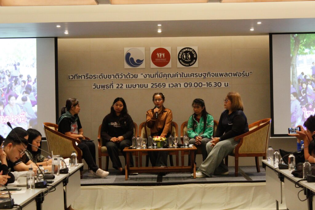 วันที่ 22 เมษายน 2569 สถาบันแรงงานและเศรษฐกิจที่เป็นธรรม (JELI) ร่วมกับสหพันธ์คนทำงานแพลตฟอร์มประเทศไทย PWOT และสหภาพคนทำงาน Workers’ Union จัดเวทีหารือระดับชาติว่าด้วย “งานที่มีคุณค่าในเศรษฐกิจแพลตฟอร์ม” โดยรวบรวมแรงงานแพลตฟอร์มจากหลากหลายอาชีพ ได้แก่ ไรเดอร์ หมอนวด คนทำงานดูแล แม่บ้าน จากหลายจังหวัดและพื้นที่ พร้อมด้วยตัวแทนจากสหภาพแรงงาน กระทรวงแรงงาน นักวิชาการด้านเฟมินิสต์ และผู้ทำงานด้านแรงงานและสิทธิสตรี เพื่อรับฟังเสียงของผู้หญิงที่ต้องทำงานท่ามกลางความเสี่ยง ทั้งอุบัติเหตุบนท้องถนน การถูกคุกคามทางเพศจากลูกค้า รายได้ที่ไม่แน่นอนและไม่เพียงพอ ระบบช่วยเหลือที่ไม่มีประสิทธิภาพ และการใช้อัลกอริทึมที่ขาดความโปร่งใส