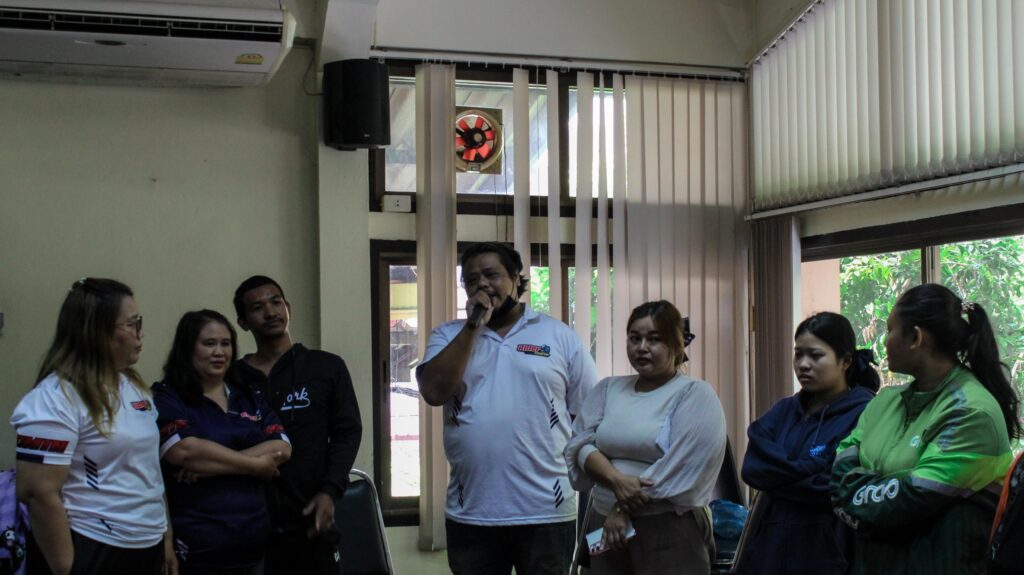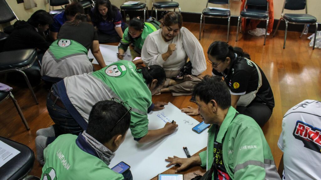 Another key activity involved examining case studies and asking participants to consider what protections would be available if they experienced accidents, sudden work interruptions, or other unexpected events. The discussion showed that workers often rely on multiple systems, including motorcycle insurance, the universal healthcare scheme, and platform-provided insurance with different conditions. However, these systems often fail to compensate for lost income or provide long-term security.