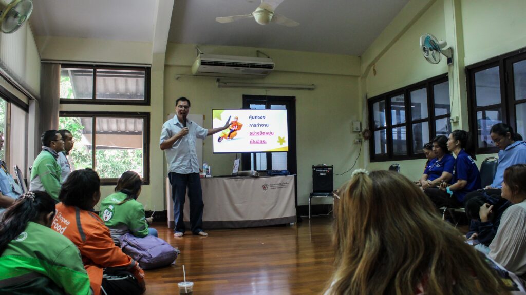 อีกช่วงสำคัญคือการถอดบทเรียนจากกรณีศึกษา ให้ผู้เข้าร่วมลองคิดตามว่าหากเกิดอุบัติเหตุ หยุดงานกะทันหัน ไปจนถึงเหตุไม่คาดฝันอื่น ๆ จะมีสิทธิอะไรคุ้มครองบ้าง ต้องติดต่อใคร ใช้กลไกใด และเพียงพอหรือไม่ การแลกเปลี่ยนนี้ทำให้เห็นว่าระบบที่มีอยู่ต้องพึ่งหลายช่องทาง ทั้ง พ.ร.บ. รถจักรยานยนต์ บัตรทอง หรือประกันของแพลตฟอร์มที่มีเงื่อนไขแตกต่างกัน และมักไม่ครอบคลุมรายได้ที่หายไปหรือความมั่นคงระยะยาว