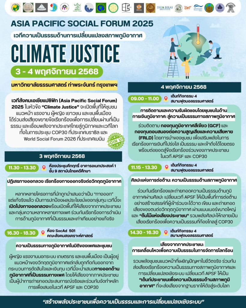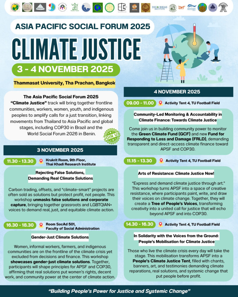 The Asia Pacific Social Forum (APSF) 2025 will take place from 1-5 November 2025 at Thammasat University, Tha Prachan Campus.
